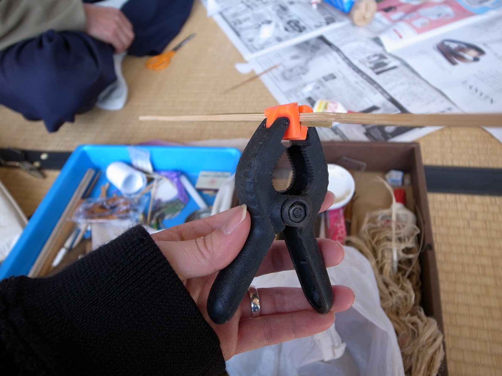 だいぶ進んできましたね。この鯛車は痛んだ和紙をはいで 貼り直しています。やはり先生が作っているだけあって 作業スピードが早いです。 |