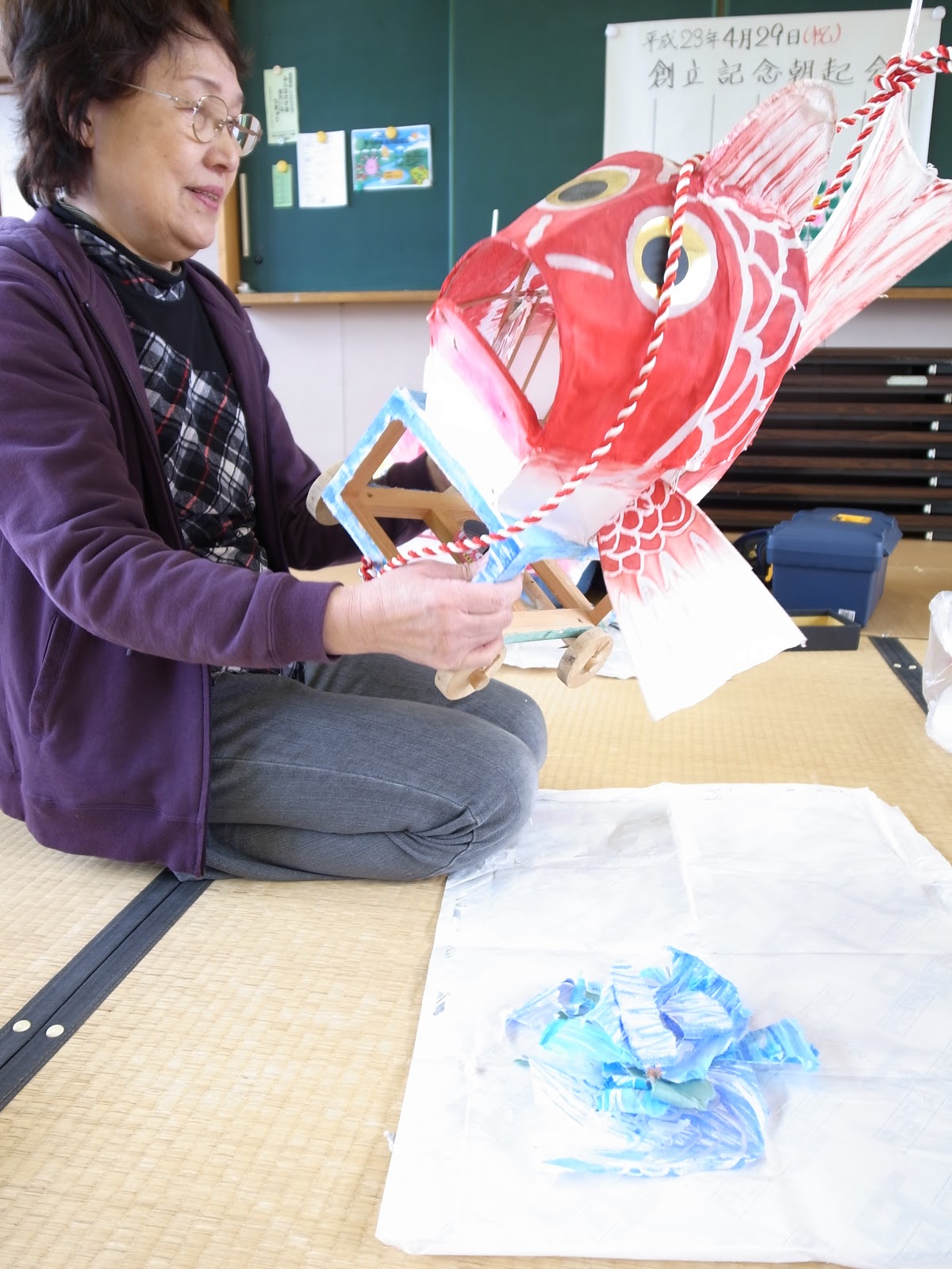 | 毎週分水から通ってきている小林さんは 2005年から始まった鯛車教室の1期生で 今ではプロジェクトの顔です。 小学校でもおしえてもらってます。 |