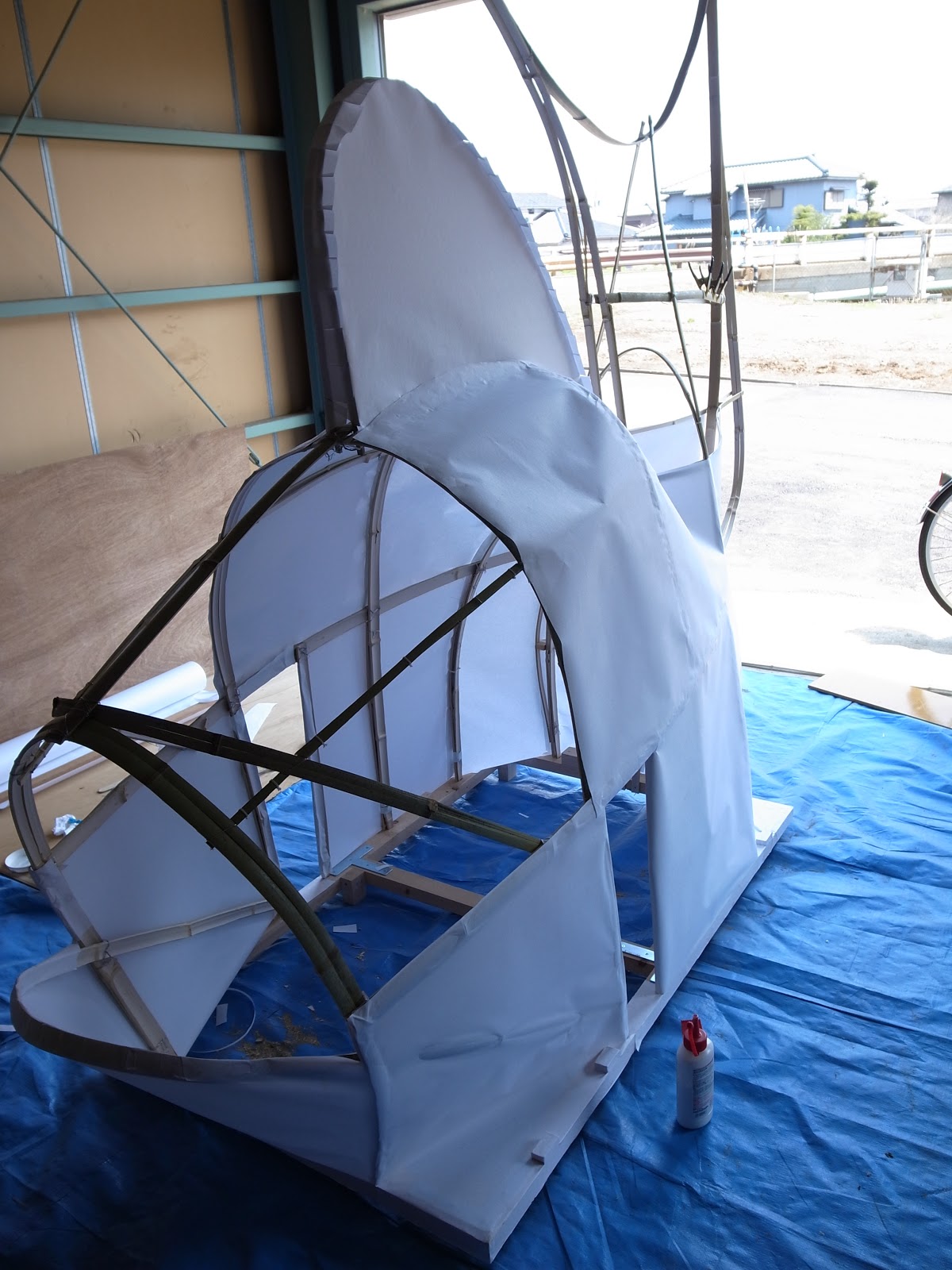 | 中から見ると自然光が和紙を通ってキレイです。 来月の半ばに地元の子どもたちと一緒に色を塗る予定です。 果たして間に合うでしょうか!? |