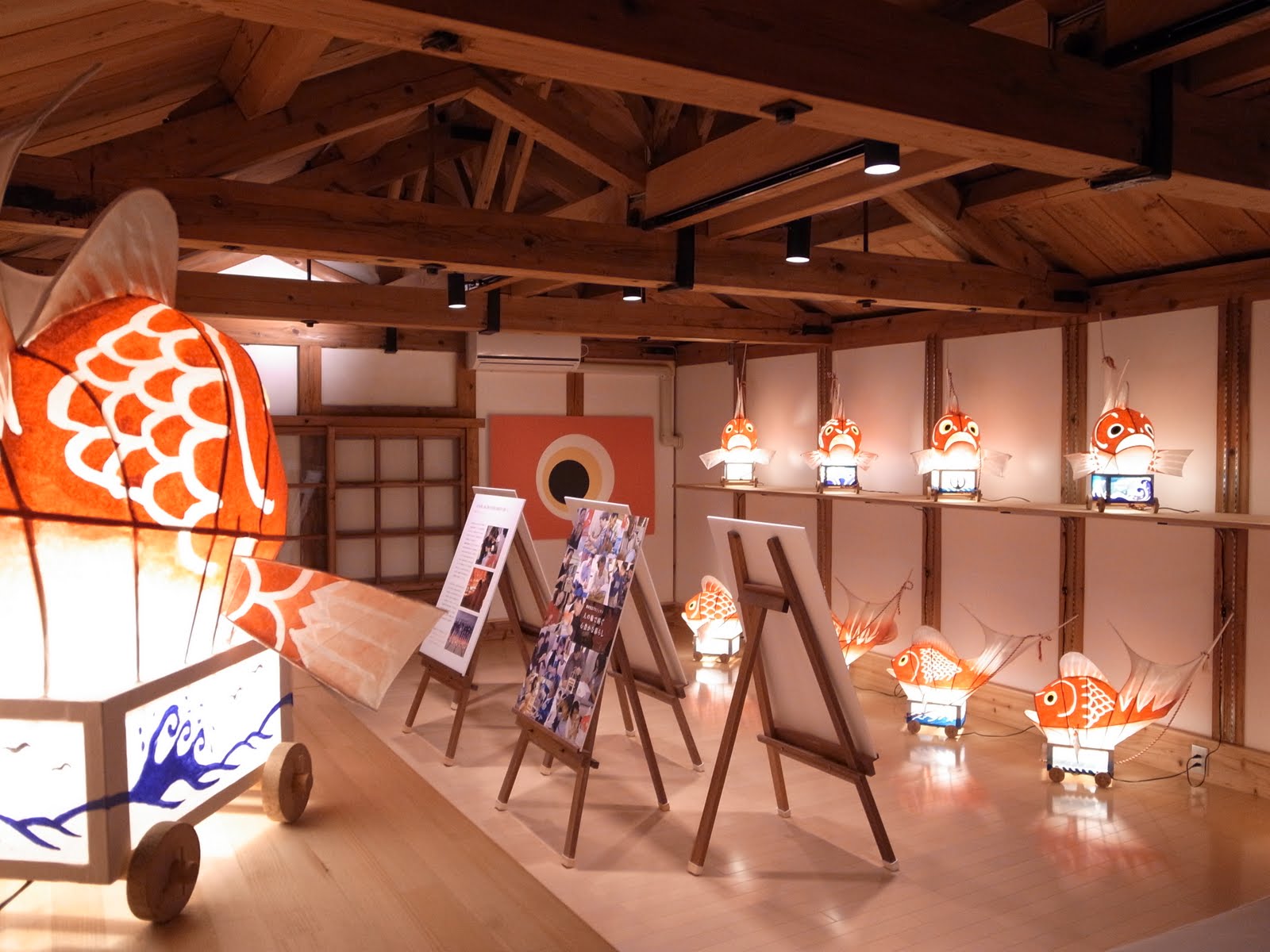 | 二階のレイアウトです。 プロジェクトのみんなで作った鯛車と プロジェクトの活動紹介パネルが並びます。 |