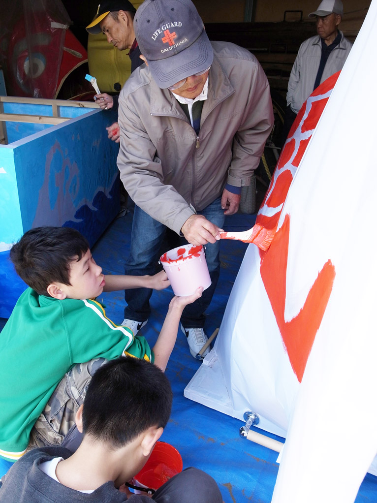 | 4m鯛車の色塗りをしています。 この辺の説明がテレビで放送されます。 |