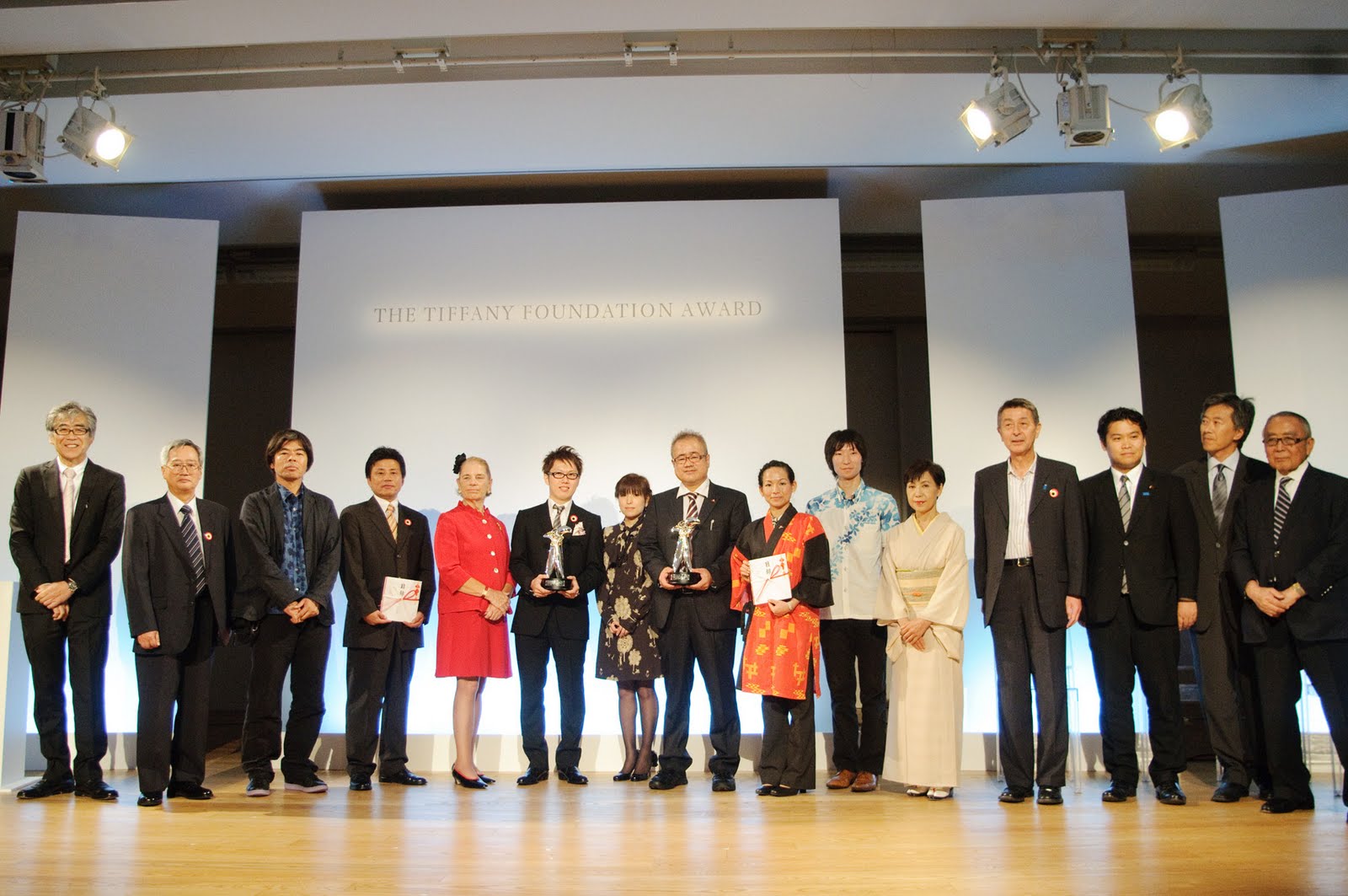 | 名前が呼ばれ登壇し、私たち鯛車復活プロジェクトは 「ティファニー財団賞伝統文化振興賞」を受賞しました。 中央左がティファニー財団のフェルナンダ・ケロッグ評議長、 左が日本国際交流センターの山本会長です。 |