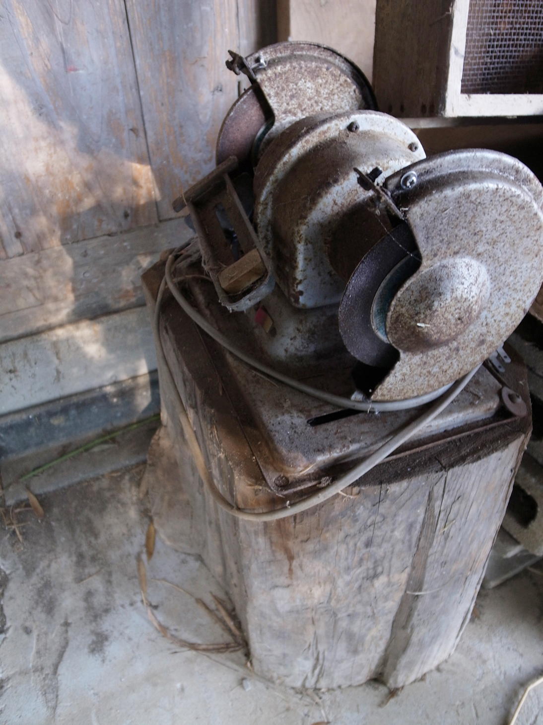 | ナタなどの刃物を研ぐ機械のようです。 なんと、まだ動きます。  |