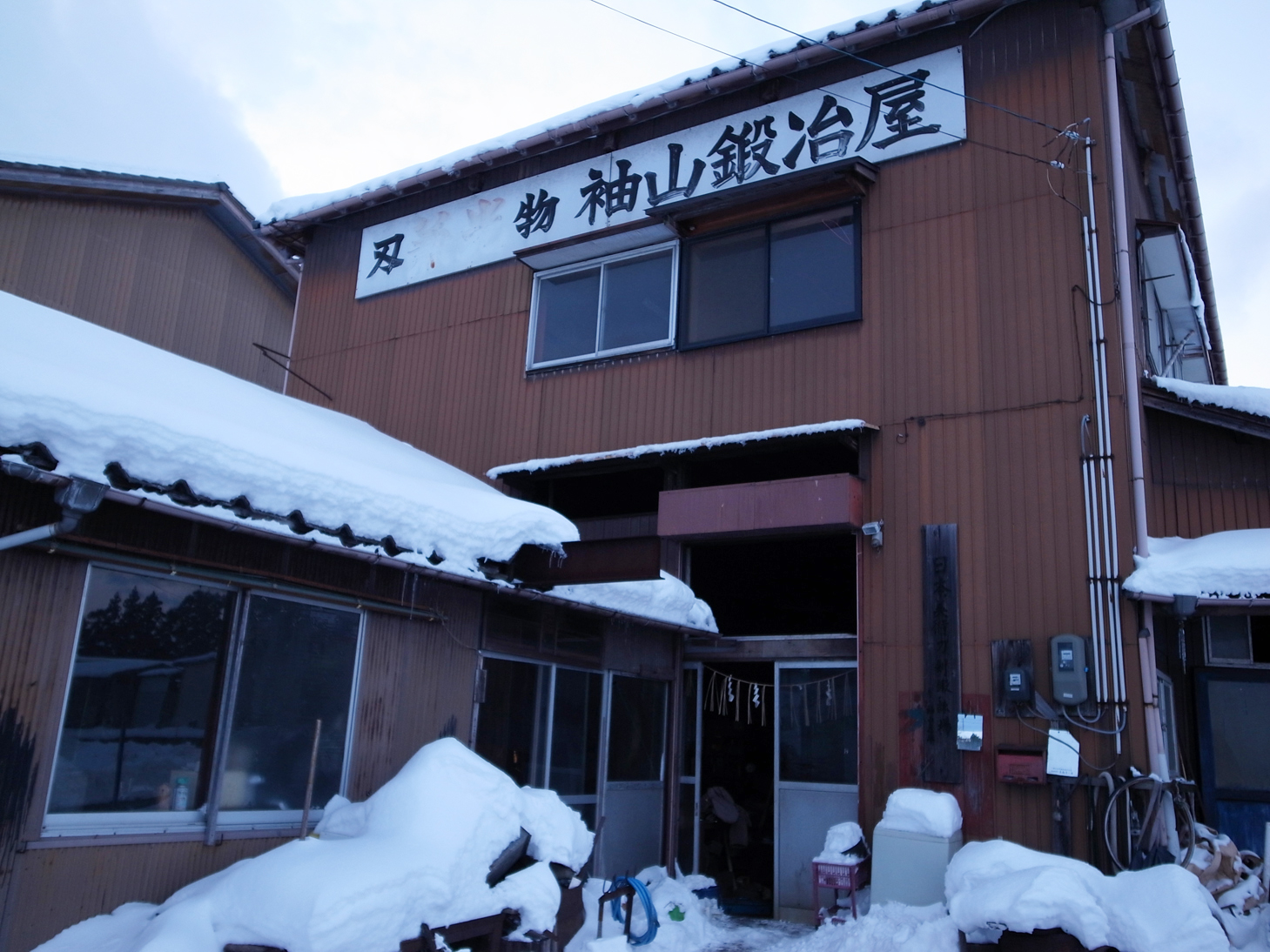 | 巻にある「袖山鍛冶屋」さんです。 袖山さんは県内で唯一の刀鍛冶職人でもあります。 刀の材料でつくる刃物は切れ味抜群です。 |