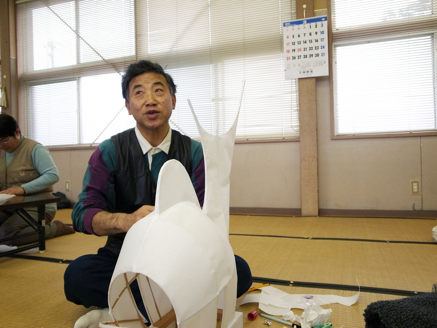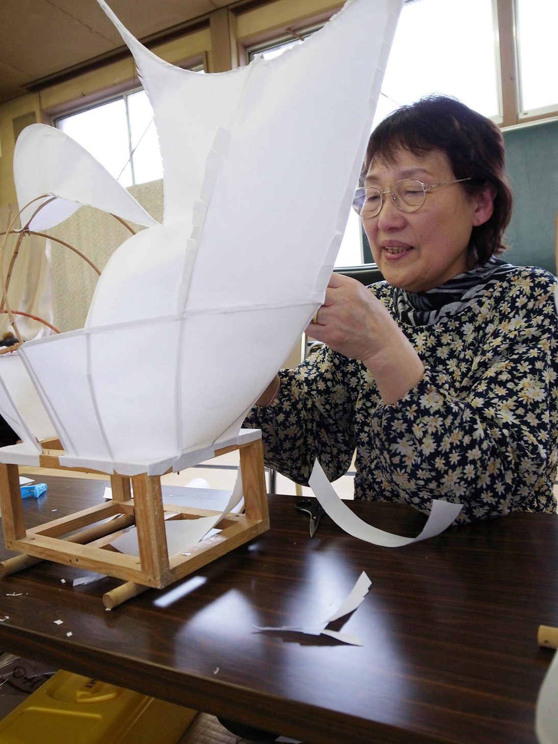 さて、鯛車修復作業は紙貼りも終盤にさしかかりました。