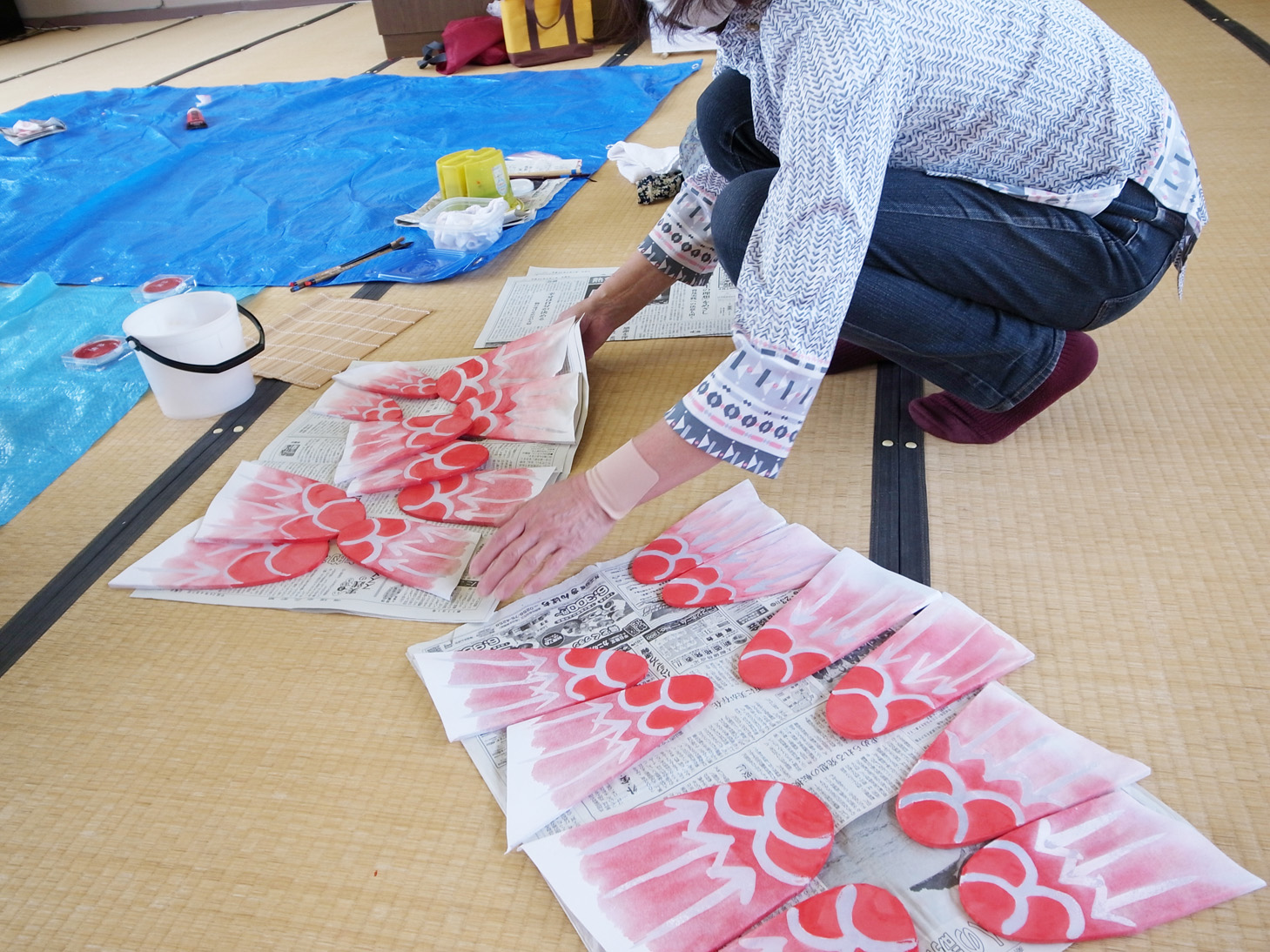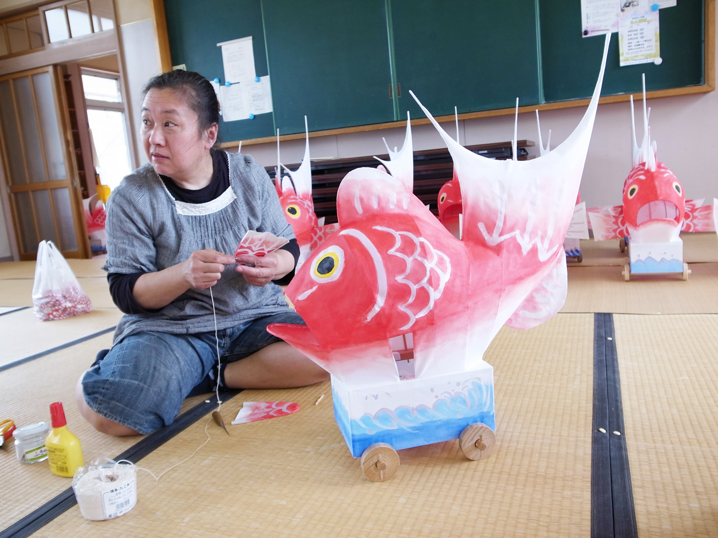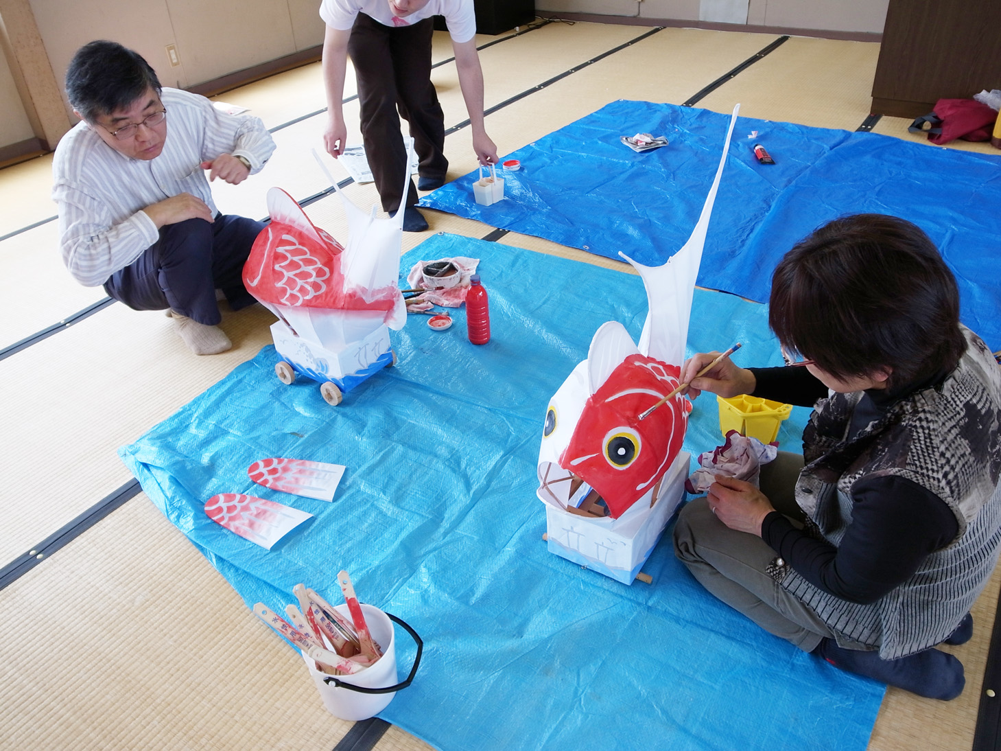 昨日はヒレを作る人、紐を結ぶ人、色を塗る人、 分業制ですごくはかどりましたよ! |