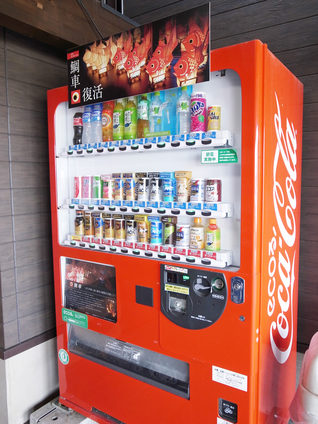 コカコーラさんとの「鯛アップ!」で生まれた 鯛車自販機です。自販機の赤と鯛車の赤がマッチしてますよね! |