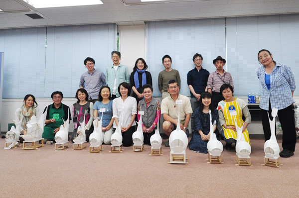 | 今回の教室は最後に必ず記念撮影しています。 明日はいよいよお楽しみの色塗り作業です。 和紙貼りがだいたい終わりみんなも一安心でした。 |