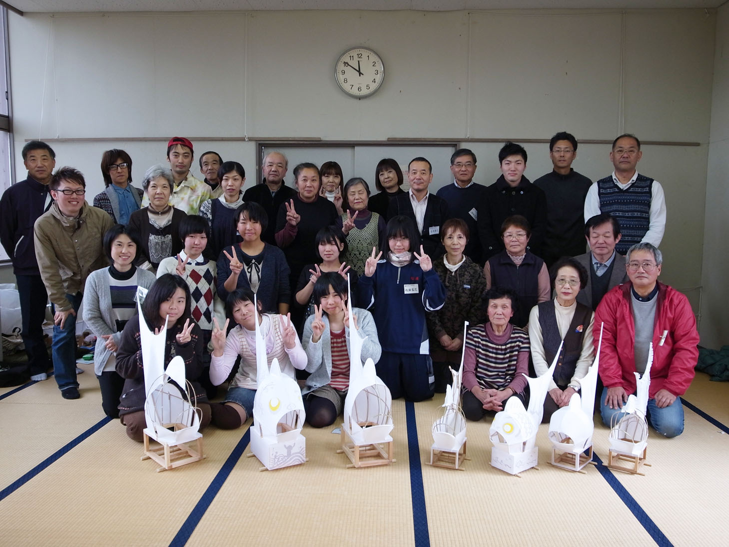 | 巻高校のみんなは最終日がテスト期間で参加できなかったため 色塗り前に記念撮影です!色が塗られた鯛車、 楽しみにしてますね。 |