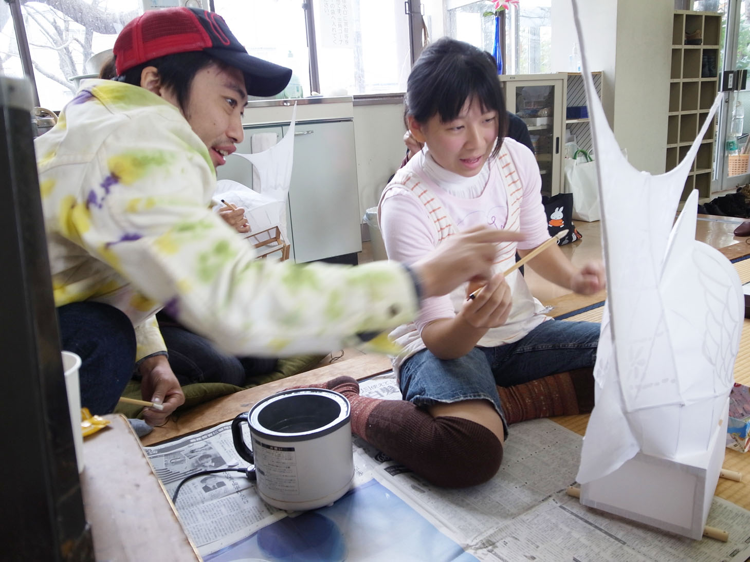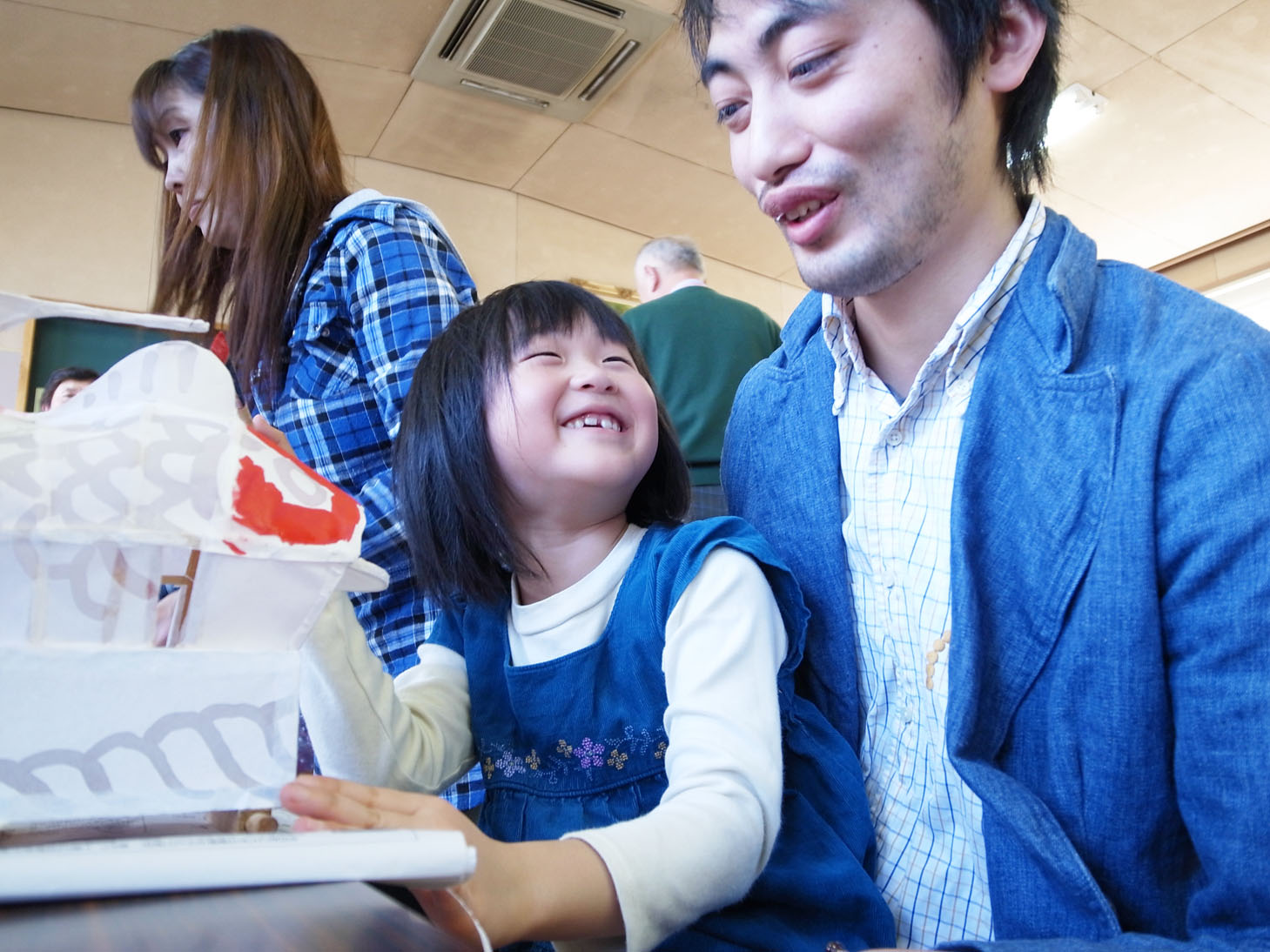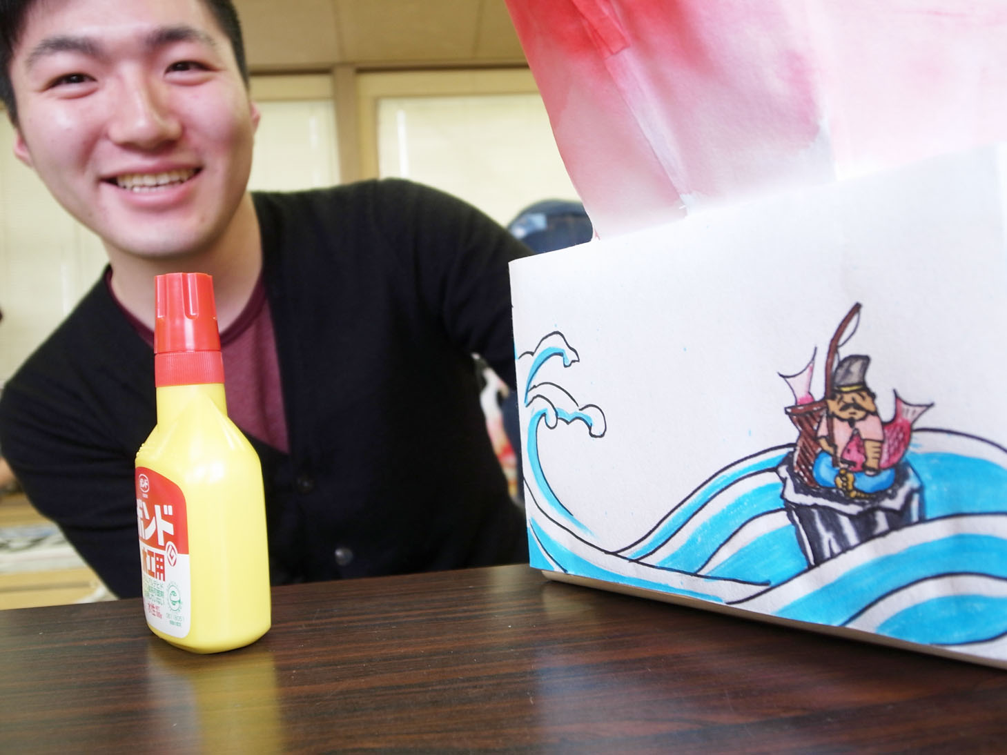 加藤先生と他の先生のお孫さんで一緒に鯛車を作ってます。