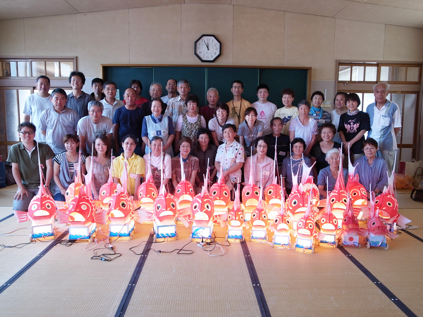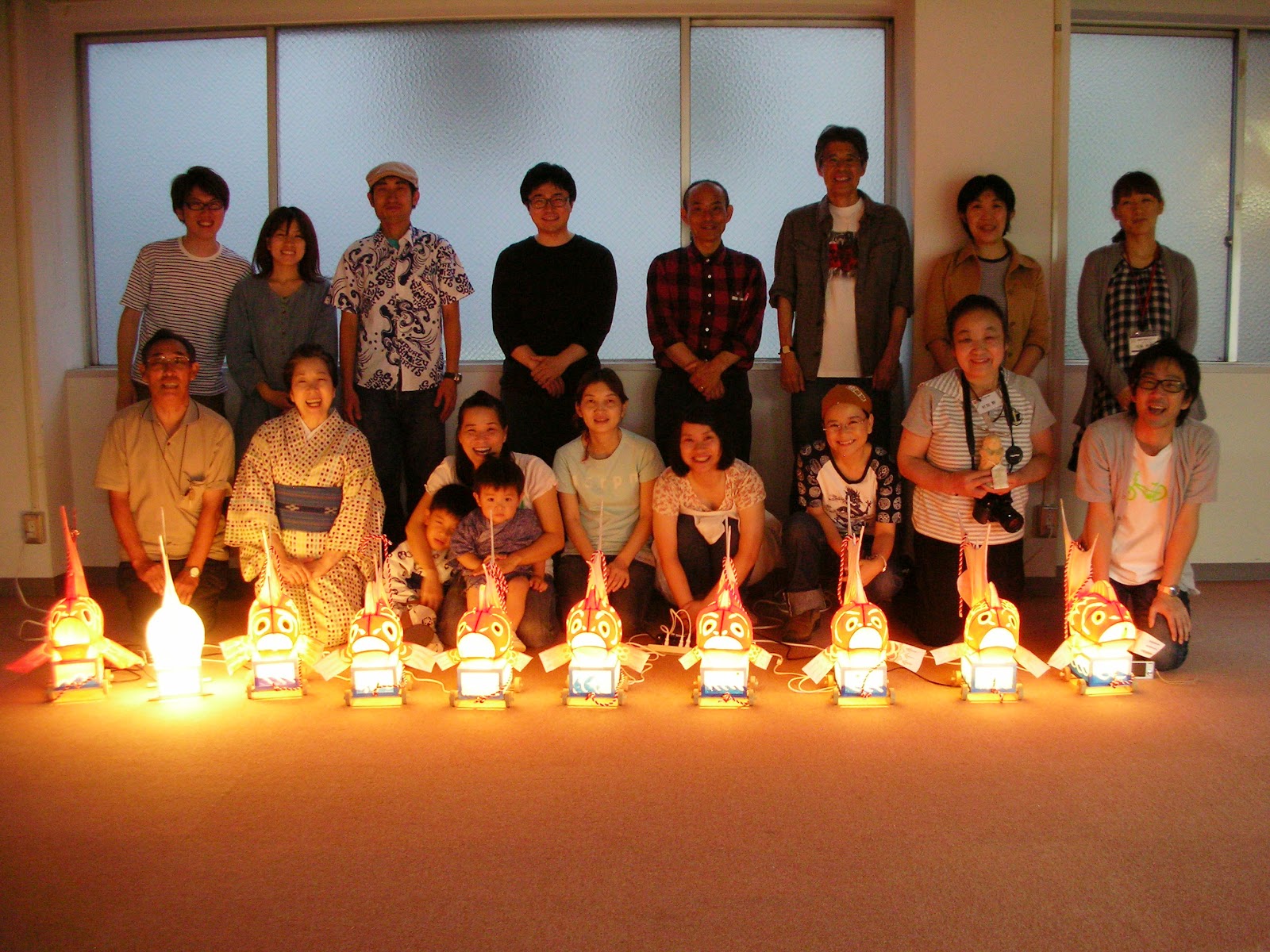 | 2008年夏の教室です。この頃から参加人数が増えてきました。 先生も増えてきて教室もスムーズになりました。 鯛車を光らせたこの瞬間、みんなの笑顔が良いんですよね! |