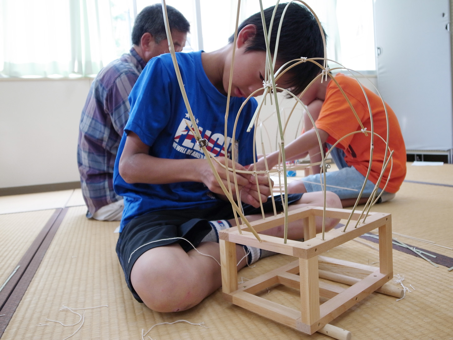 | 真ん中の男の子は昨年小学校で鯛車を作った子です。 なんとその子が今年中学生になったにもかかわらず 部活の後に後輩達におしえに来てくれたのです。 後継者は間違いなく育ってますね! |