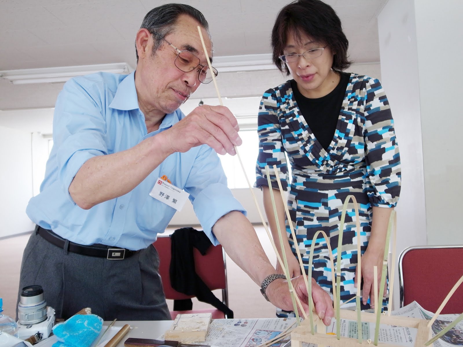 | お昼を食べて始まりました! 左は巻出身の野澤先生、右の方は長野から 通われています。昨年長野からまち歩きのサミットで 巻を訪れた際に鯛車に惚れ込んだそうです。うれしいですね! |