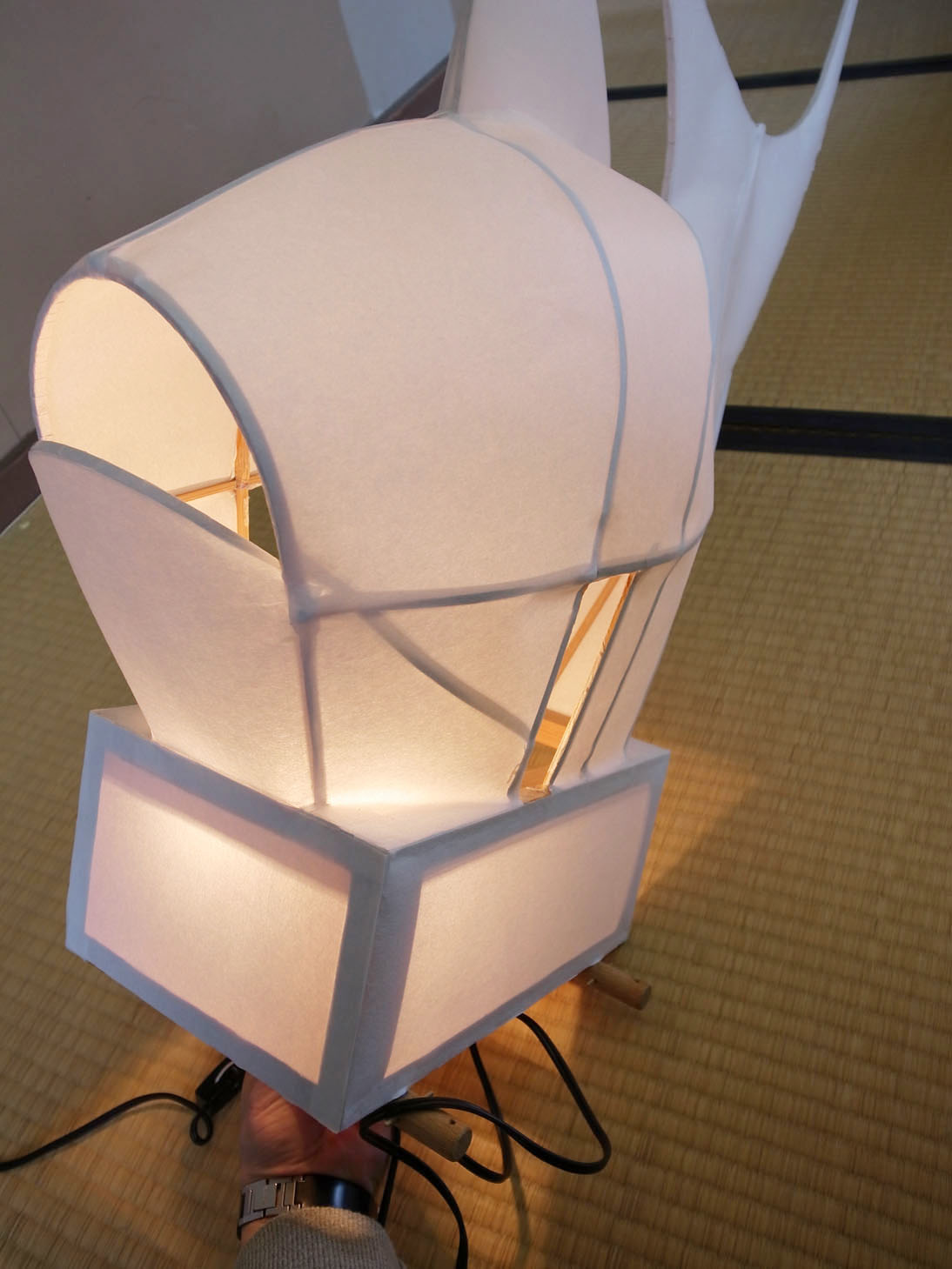 | 農具に和紙を張り、再利用したものがこちら。 素敵な証明ですね!中にろうそくが入ります。 午前担当の美智子さんと昔の田植えの話で 盛り上がりました! |