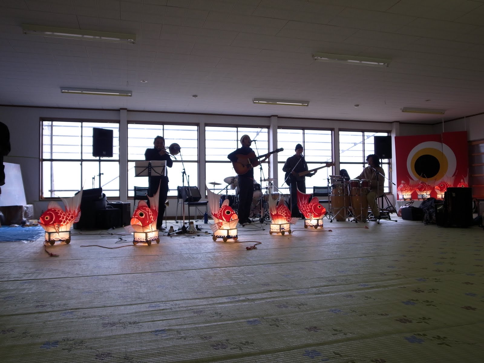 土日は会場の浜茶屋でライブがあったのですが、 鯛車のあかりでアーティストが音楽を披露しました。 もちろん初めての試みです。 |