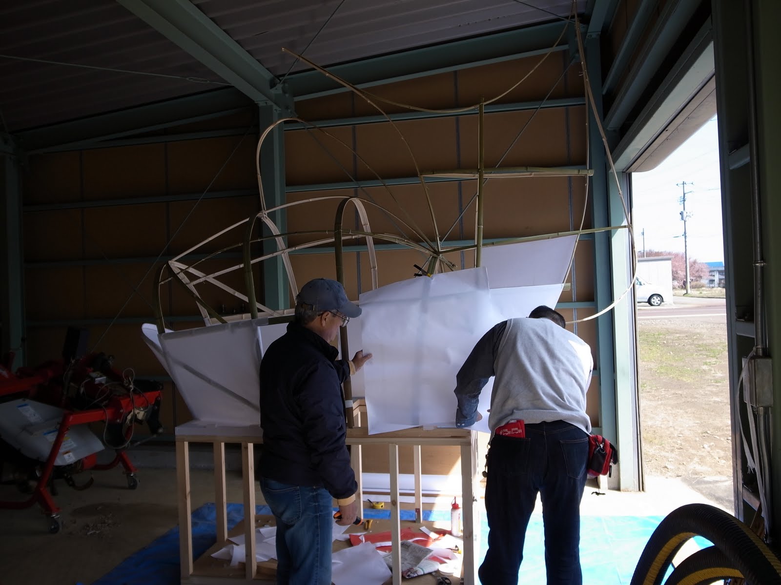 巨大鯛車も遂に和紙が貼られました。 段々完成が見えてきましたね。 |
