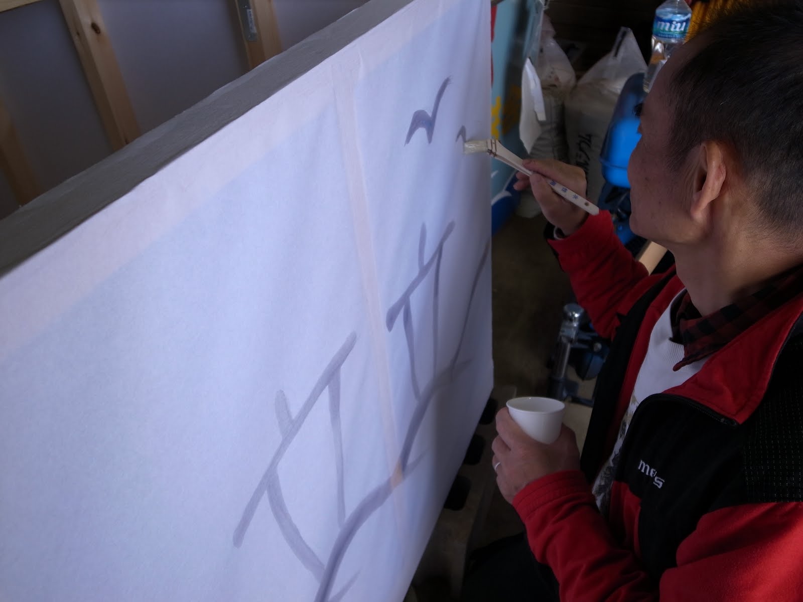 台座の紙を全て剥がして貼り直しています。 柿崎さんは県展で入賞するほどの絵の腕前です。 |