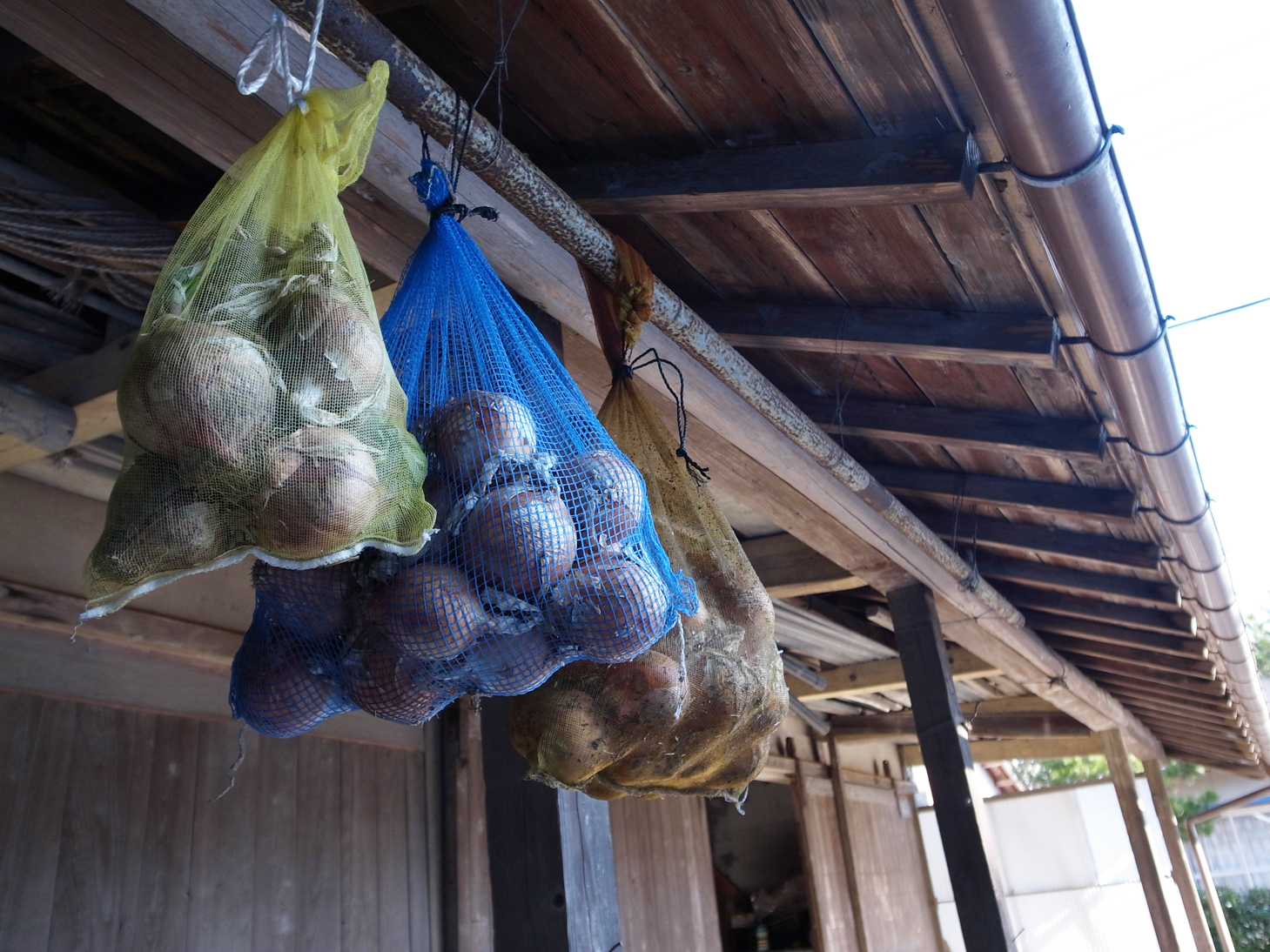 | いつも野菜が吊るしてあります。 秋には干し柿なんかもあって、この感じが大好きです。 |