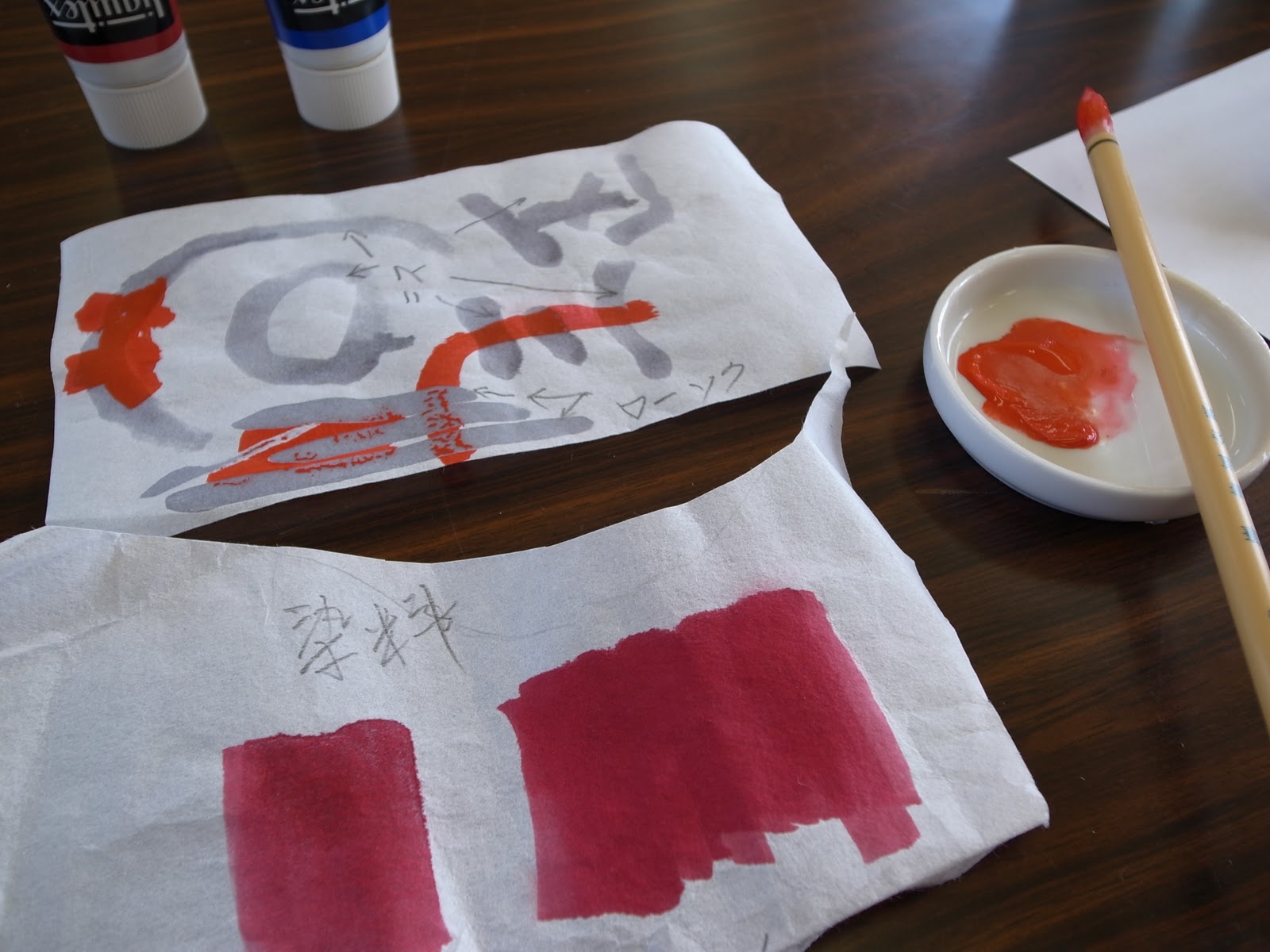 | ジャンボ鯛車の色合いを試しています。 上の写真は雨が降っても絵の具がにじまないように 絵の具に特殊なコーティングを施しました。 |