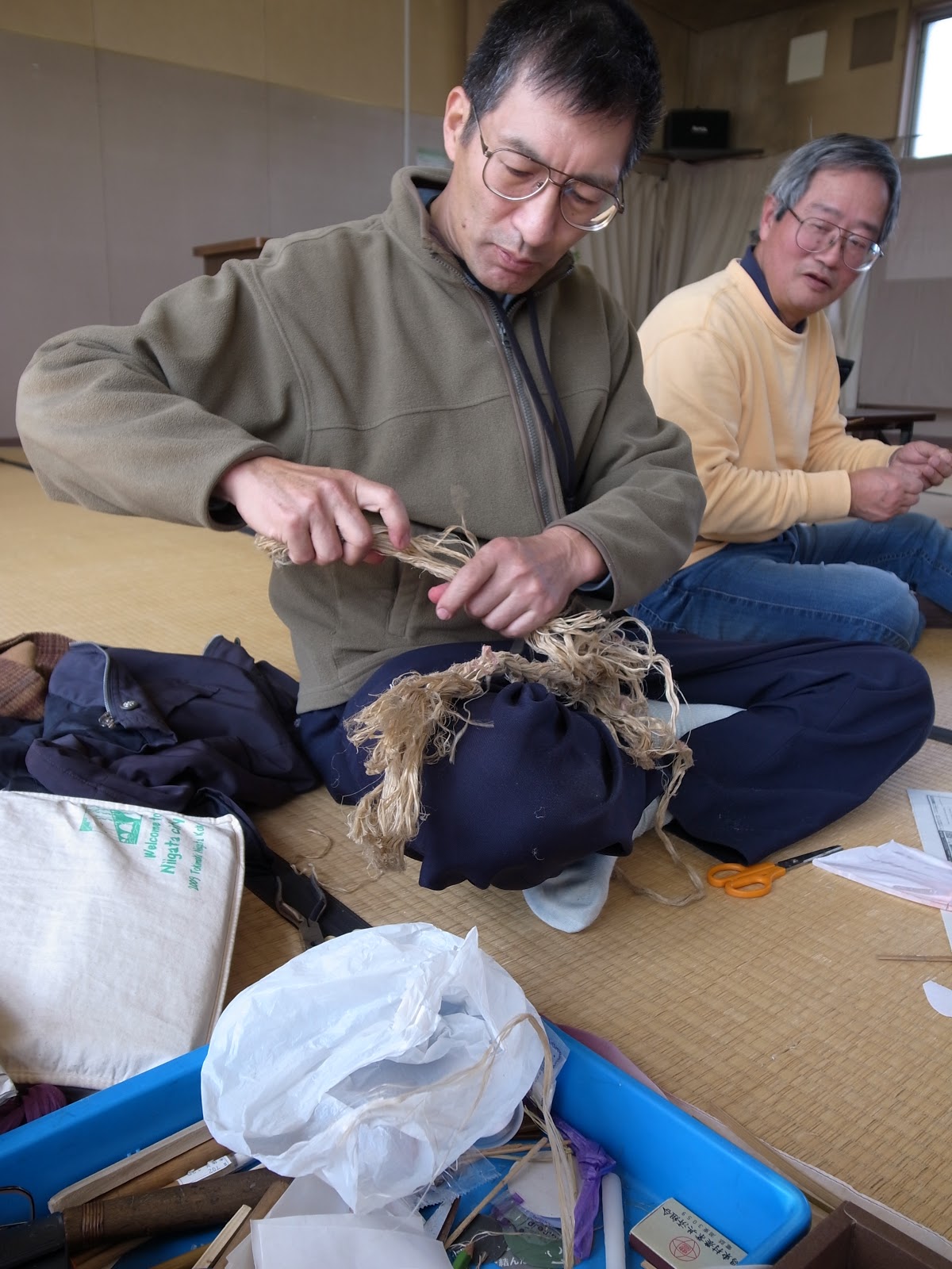 | 鯛車ではヒレを固定する際に細かく編んで使っているそうです。 西片さんにお話を聞いたところ大凧一枚に使う麻のヒモは 100万円以上もするそうです。しかも3年ほどしか持たないとのこと。 知らなかった。。。 |