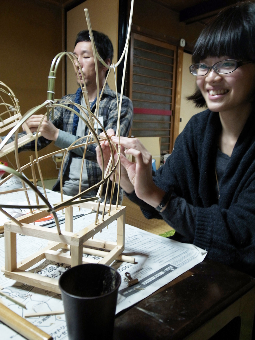 | 最後に、まだ途中ですが恒例の記念撮影です。 2日間で紙張りは半分まで行きましたよ! |